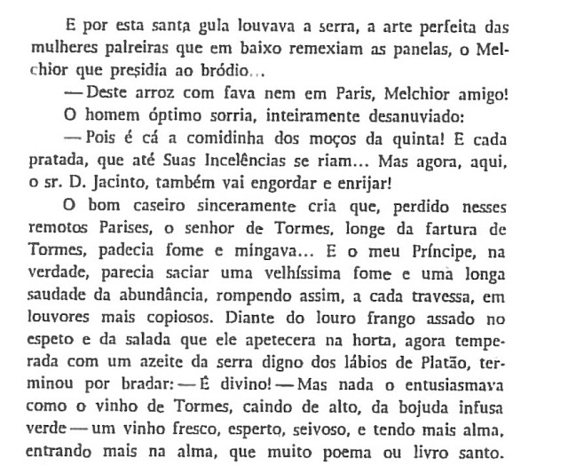 Fica a gente com os beiços ensanguentados e a cara marcada como se se tivesse morto alguém à dentada ... Eu gosto muito de ir à horta num dia de calor. As ruas muito sombrias cobertas com arvores de frutas, os encaniçados de feijões em flor, as latadas de aboboras e até as melancias à torreira do sol têm um aspecto fresco.